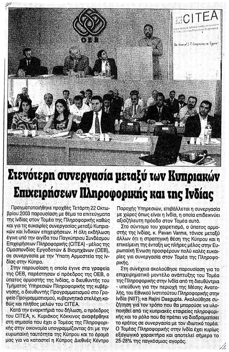 Το 2003 ο Παγκύπριος Σύνδεσμος Επιχειρήσεων Πληροφορικής (CITEA), μέλος της ΟΕΒ, σε συνεργασία με την Ύπατη Αρμοστεία της Ινδίας στην Κύπρο, πραγματοποιούν εκδήλωση με θέμα το ινδικό μοντέλο ανάπτυξης στον τομέα της πληροφορικής και τις προοπτικές συνεργασίας…