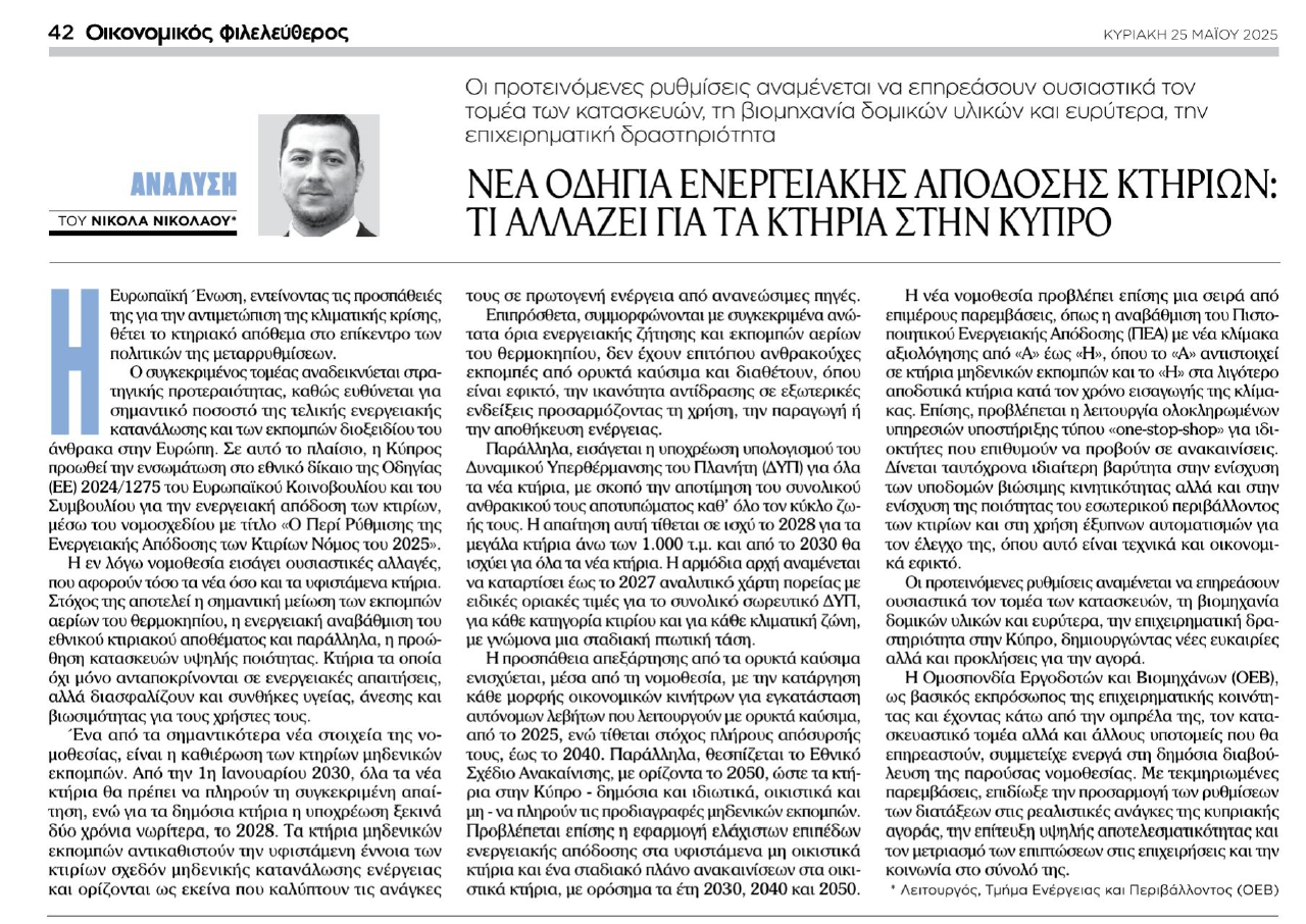 Άρθρο του Λειτουργού, Τμήμα Ενέργειας & Περιβάλλοντος ΟΕΒ, Νικόλα Νικολάου.
