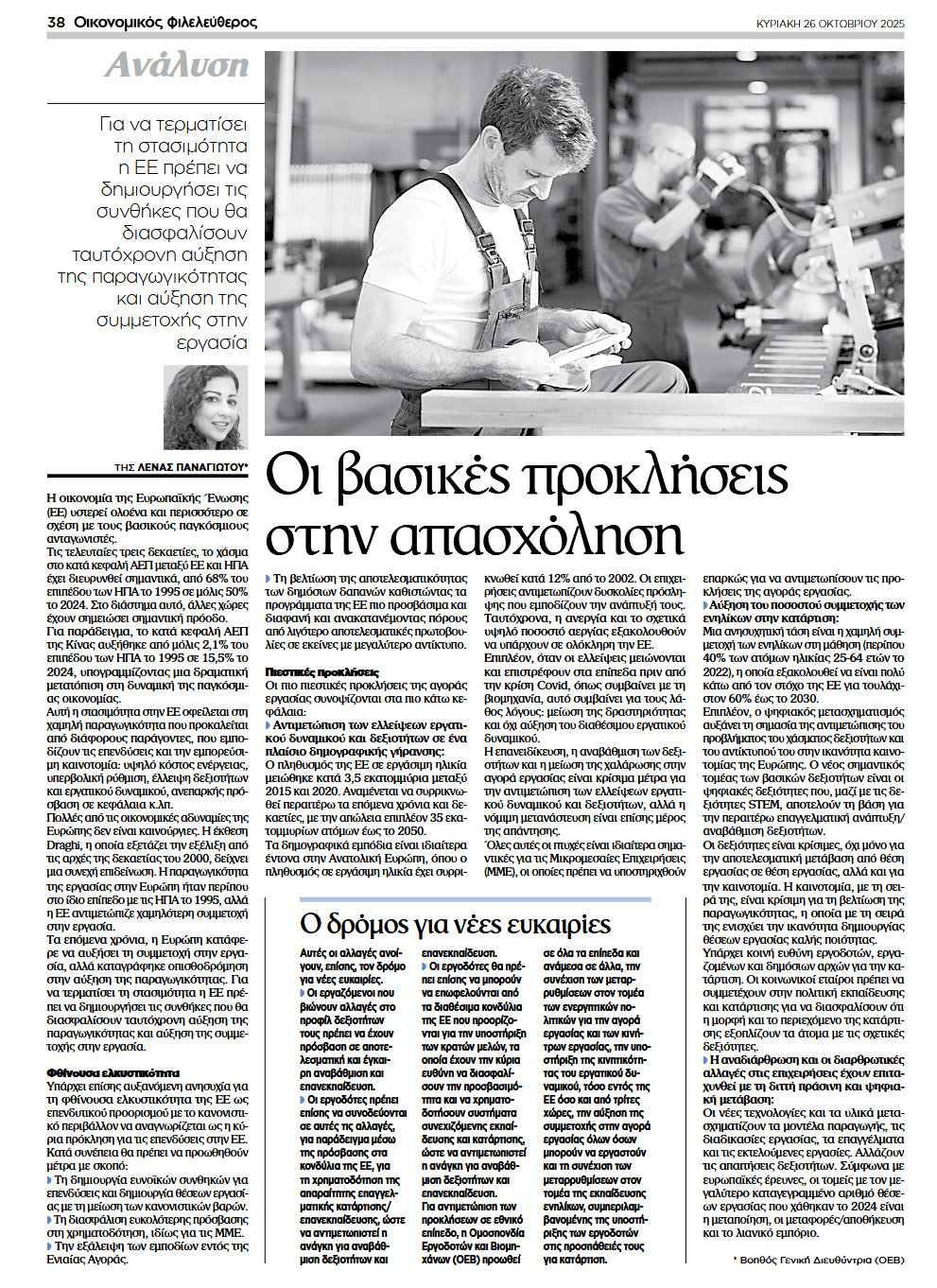 Οικονομικός Φιλελεύθερος (26/10/2025): “Οι βασικές προκλήσεις στην απασχόληση”