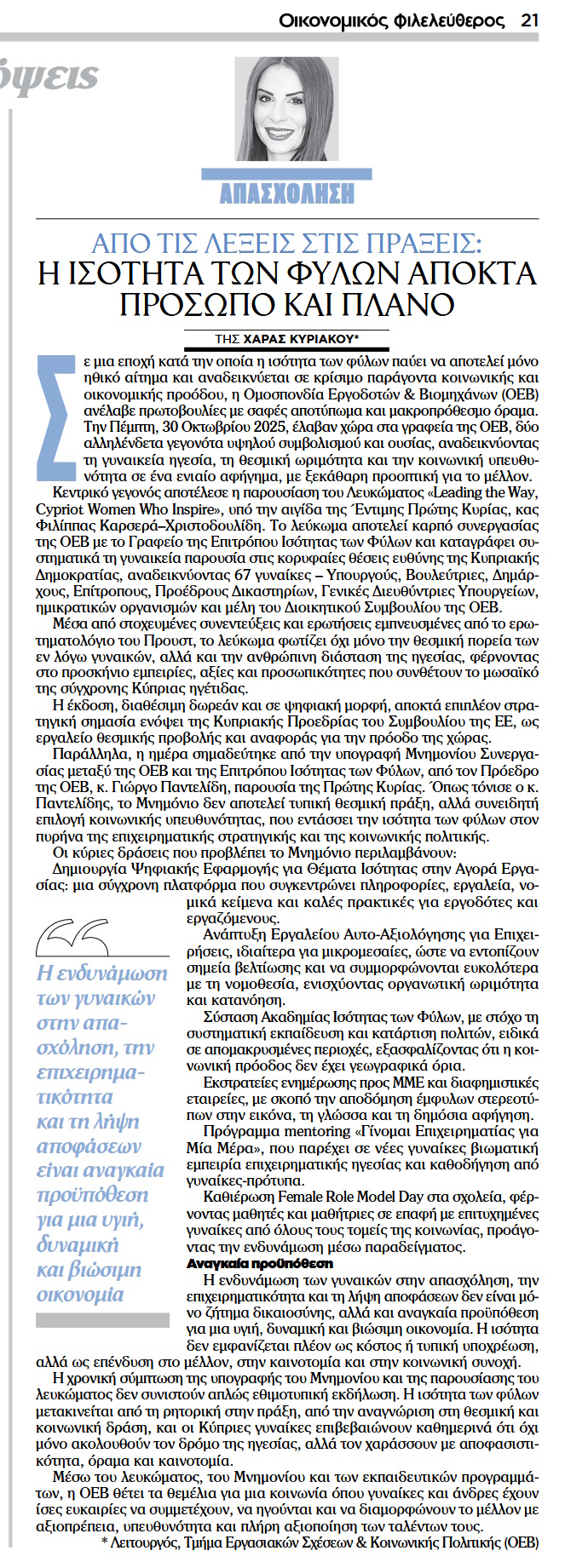 Άρθρο της Λειτουργού, Τμήμα Εργασιακών Σχέσεων & Κοινωνικής Πολιτικής ΟΕΒ, Χαράς Κυριάκου.